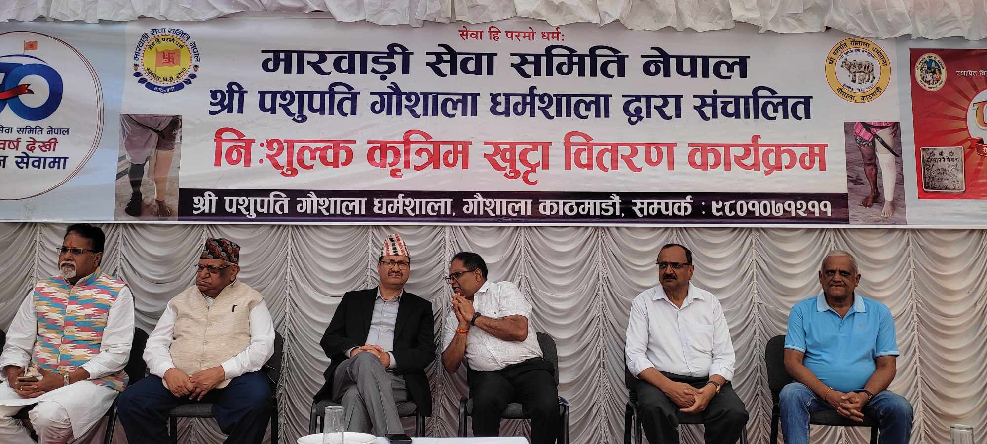 मारवाडी सेवा समितिले २०५६ सालदेखि पशुपति गौशाला धर्मशालाद्वारा निशुल्क रुपमा कृत्रिम खुट्टा वितरण गर्दै आएको छ । शनिबार कार्यक्रममा आयोजना गरेर समितिले ७ जनालाई निशुल्क रुपमा खुट्टा वितरण गरेको छ ।