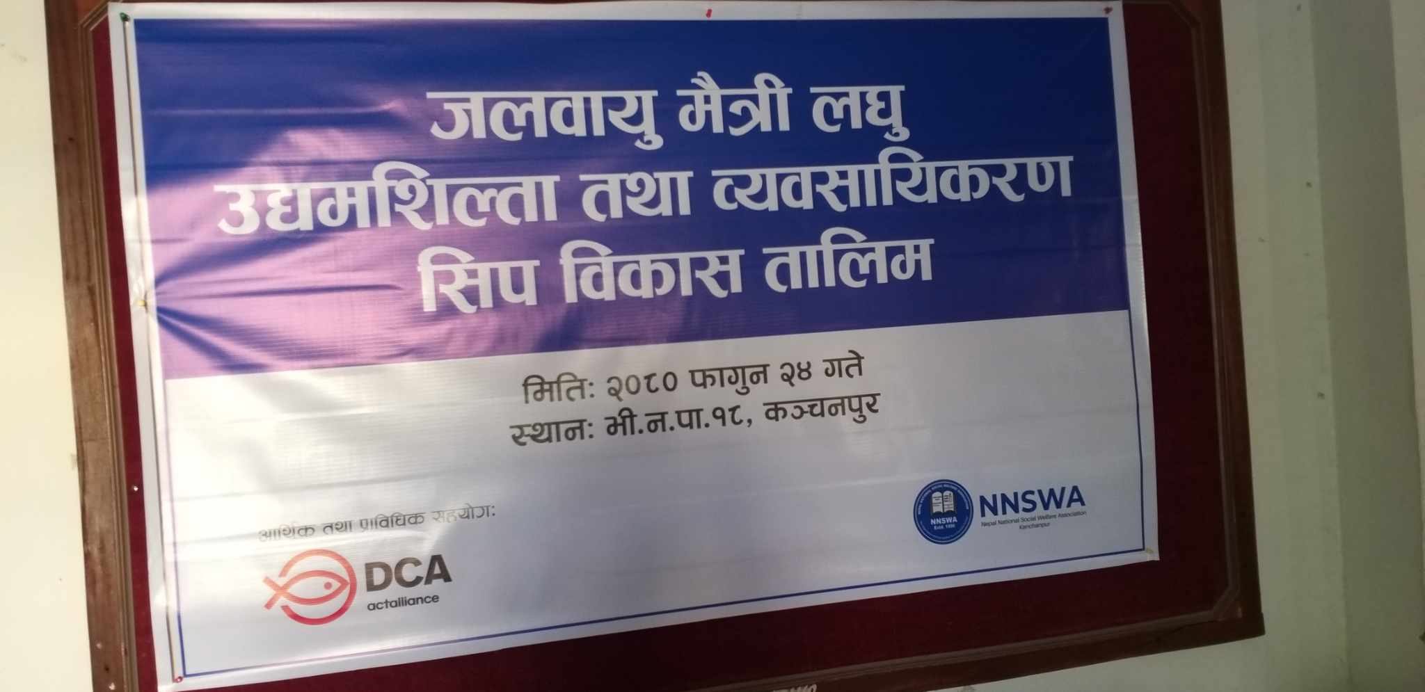 संघले कञ्चनपुरको दोधारा चाँदनी नगरपालिका र भिमदत्त नगरपालिकाका ४२ जना उद्यमी, कृषक,सामुदायिक वन उपभोक्ता समितिका सदस्यहरुलाई जलवायु मैत्री लघु उद्यमशिल्ता तथा व्यावसायीकरणबारे प्रशिक्षण दिदै तालिम सम्पन्न गरेको हो ।