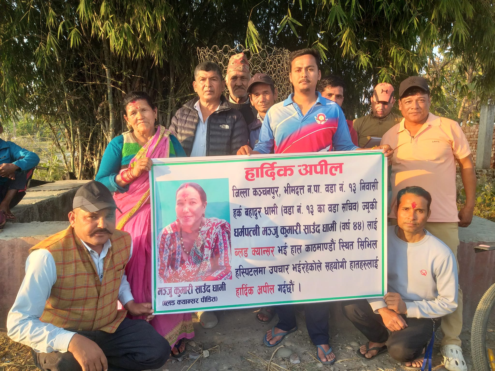 महेन्द्रनगर । भीमदत्त नगरपालिका १३ का वडा अध्यक्ष रामचन्द्र बोहरा(झकास) ले वडा सचिव हर्क बहादुर धामीकी धर्मपत्नि मन्जु साउँद धामीको उपचारका लागि सहयोग संकलन अभियान सुरु गरेका छन् । ब्लड क्यान्सर देखिएपछि वडा सचिव पत्नि धामी उपचारका लागि काठमाडांैको सिभिल हस्पिटलमा भर्ना भएकी छन् ।