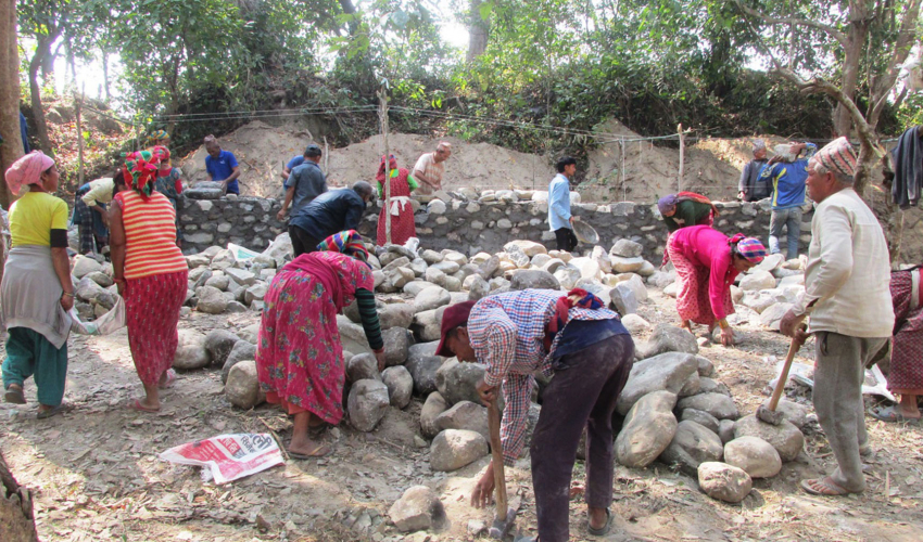 महेन्द्रनगर । शुक्लाफाँटा नगरपालिका–८ स्थित दुर्गा भगवती मन्दिर परिसरमा ढुङ्गाको पर्खाल निर्माण गर्दै स्थानीय बासिन्दा।