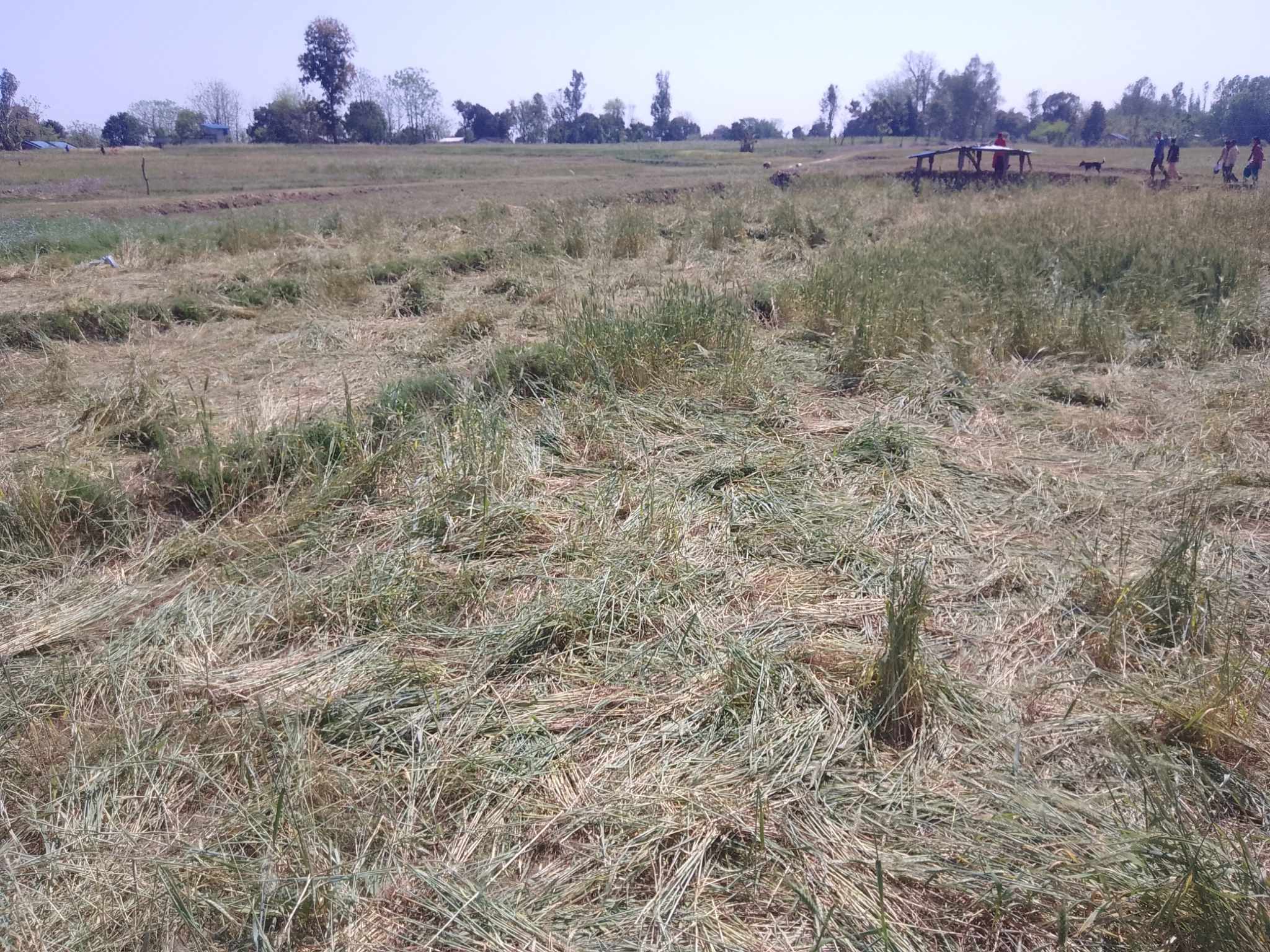 स्थानीय करन सिंह धामी, दुर्गादेवी जैसीको १ बिगाहा, चेतराम चौधरीको ८ कट्ठा, सन्तोष ऐरीको ३ कट्ठा जमिनमा लगाएको गहुँ बाली र केरा बारीमा क्षति गरेको किसानहरूले बताएका छन् । राती ११ बजे आएको हात्तीको बथान बस्तीमा पस्दा स्थानीयहरू रातभर हात्ती धपाउन जाग्राम बस्नुपरेको किसान चेतराम चौधरीले बताए ।