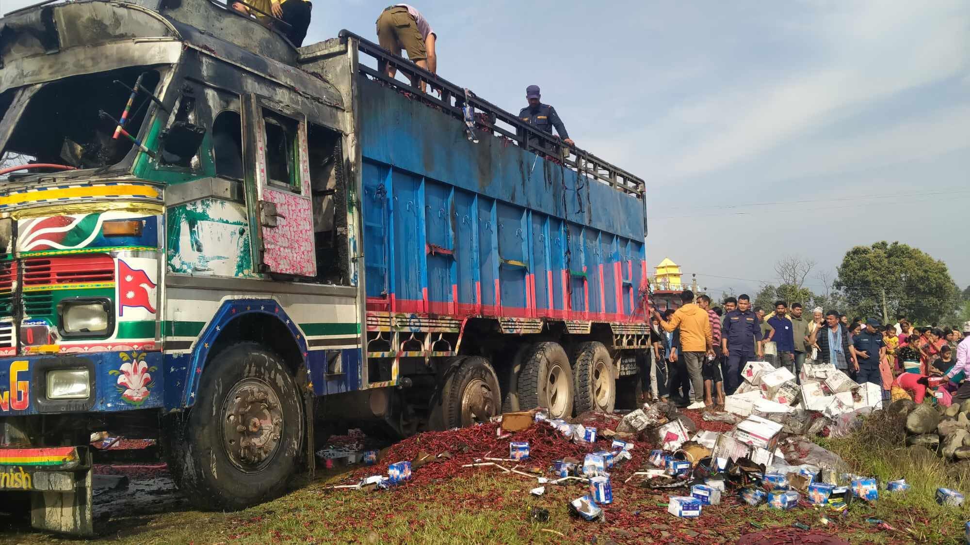 लाइटर र खुर्सानी बोकेको ट्रकमा आगलागी