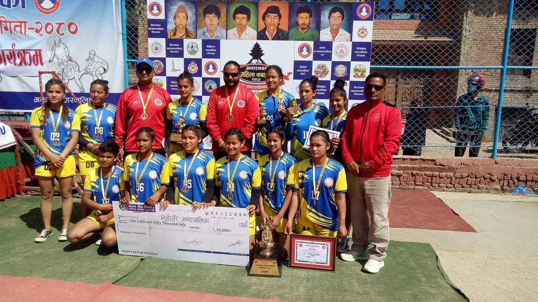 भक्तपुर नगरपालिकाको आयोजनामा सञ्चालन भएको अन्तरपालिका महिला कबड्डी प्रतियोगितामा देशका विभिन्न पालिकाहरूकाे सहभागीता रहेकाे छ। अखिल नेपाल कबड्डी सङ्घबाट मान्यता प्राप्त कबड्डी प्रतियोगितामा आयाेजना भएकाे हाे । नेपालमै पहिलो पटक आयोजना गरिएको प्रतियोगितामा बैतडीको मेलौली नगरपालिका पनि सहभागि भएकाे थियाे।