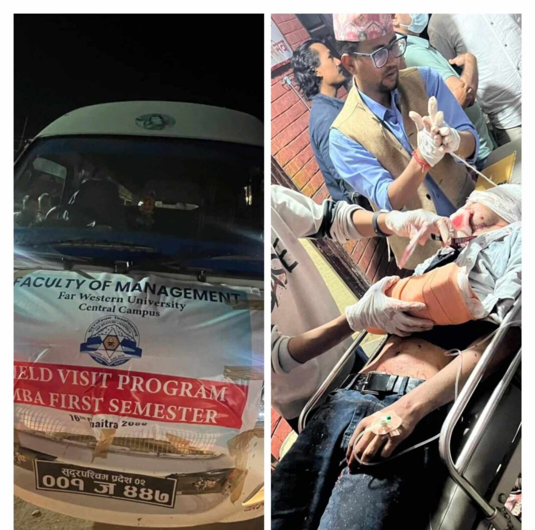 महेन्द्रनगर । फिल्ड भिजिटबाट फर्किदै गरेको शुदुरपश्चिम विश्वविद्यालयको फस्ट सेमिस्टरका विद्यार्थी बोकेको गाडि दुर्घटना हुदा पाच जना विदार्थीहरु घाईते भएका छन् ।