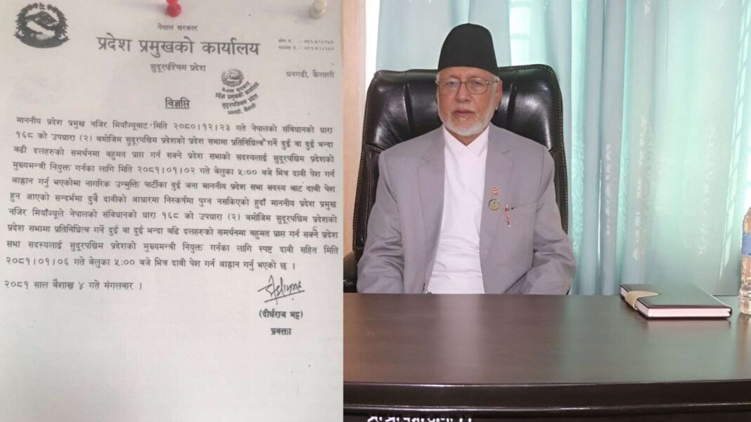 सत्ता गठबन्धन दलको खटपट मिलाउन सुदूरपश्चिम प्रदेशका प्रदेश प्रमुख नजिर मियाँले पुनः संविधानको धारा १६८ (२) अनुसारकै मुख्यमन्त्रीमा दाबी पेस गर्ने समय दिएका छन् ।