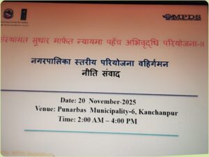 कञ्चनपुर, ०४ मसिर कञ्चनपुरको दक्षिणी भेग स्थित पुनर्वास नगरपालिकामा लक्षित समुदायका व्यक्तिको समस्या समाधान गर्न सरोकारवालासंग कानुन, न्याय तथा संसदीय मामिला मन्त्रालयसँगको समन्वय तथा युएनडिपिको आर्थिक सहयोगमा, बहुद्देश्यीय विकास समाज डडेल्धुराले पुनर्वास नगरपालिकामा कार्यान्वयन गर्दै आएको संस्थागत सुधार मार्फत न्यायमा पहुँच अभिवृद्धि परियोजना अन्तर्गत पुनर्वास नगरपालिका न्यायिक समिति संगको सहकार्यमा सञ्चालन हुदै आएको नगरपालिका स्तरीय ईग्जिट पोलिसी संवाद कार्यक्रम सम्पन्न भएको छ।