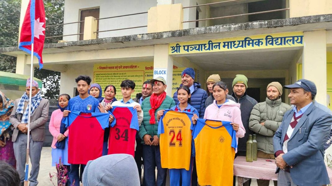 महेन्द्रनगर । सीता सामुदायिक वन उपभोक्ता समूहको आर्थिक वर्ष २०८२र८३ को वार्षिक कार्ययोजनामा समावेश कार्यक्रमअनुसार श्री पञ्चाधिन माध्यमिक विद्यालय, कृष्णपुर नगरपालिका–९, राजघाटका विद्यार्थी खेलाडीहरूलाई १५औँ राष्ट्रिय रनिङ शिल्ड प्रतियोगितामा सहभागिताका लागि ५० थान जर्सी हस्तान्तरण गरिएको छ। जर्सी विद्यालय व्यवस्थापन समितिलाई एक अनौपचारिक कार्यक्रममार्फत हस्तान्तरण गरिएको हो।